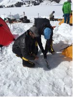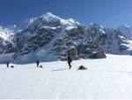 Our day started 6:00am had bagels with grilled cheese, and oat meal long day ahead I had to load up. Right after breakfast we took down the camp and packed the gear left in our backpacks and sledges. We had about 25kgs or a bit more when we left camp 1, 2,300m above sea level at 8:30am. The sun was still behind the mountain which means it was a bit cold below zero by the first beak an hour later the sun came up so as the heat. We were in a valley of ice, surrounding us. Just like a microwave. By the time we reached the cache point 2,800m it was HOT. About 30 degrees plus now we are picking up the rest of our gear and will head up.